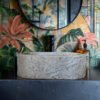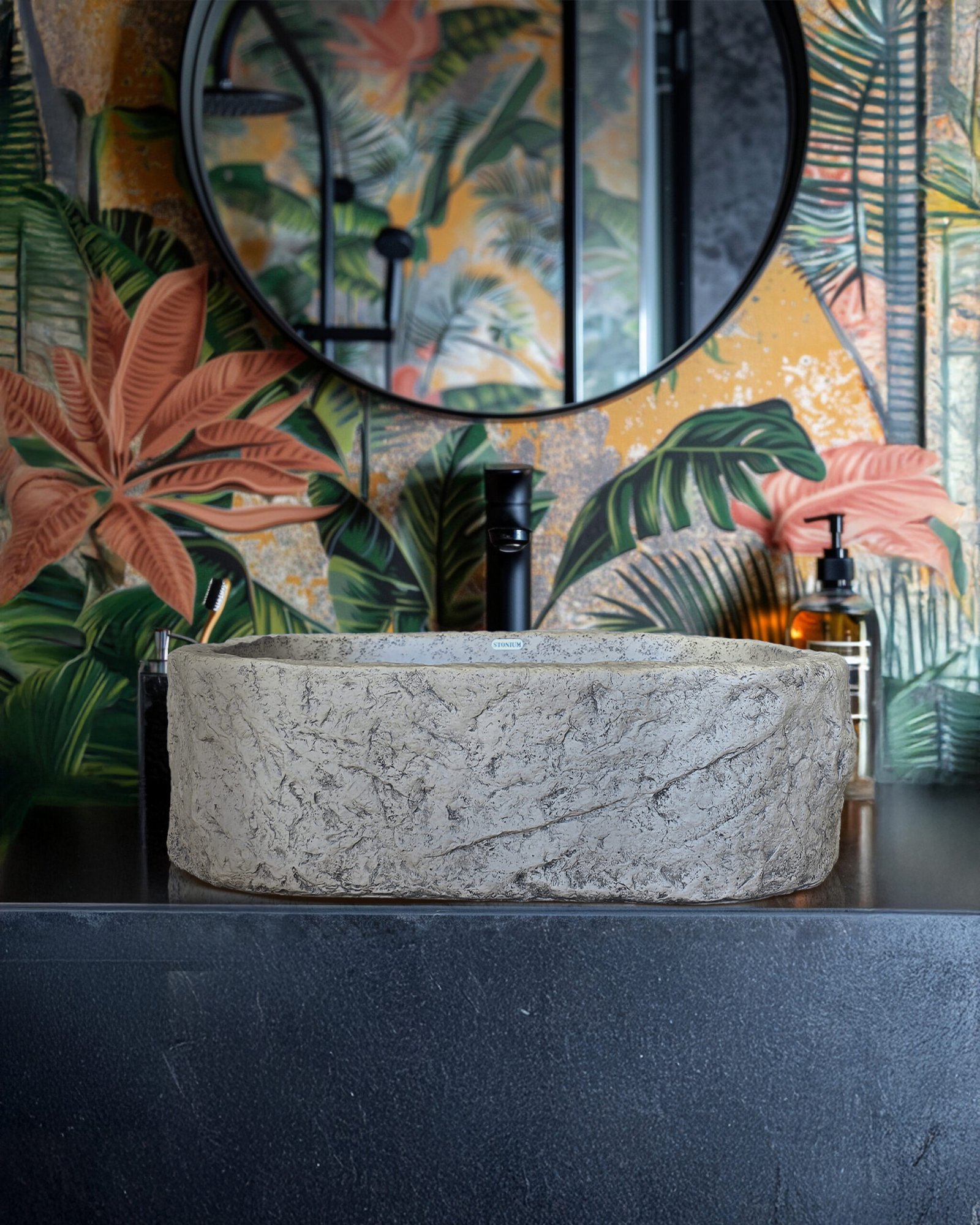 The Orion basin grounds the Natura collection with a bold presence and rich textural depth. Its rectangular silhouette amplifies the visual rhythm of the horizontal rocky surface, evoking the raw power of carved stone. With generous width and a confident stance, Orion makes a strong impression on the vanity, bringing a sculptural quality that feels deeply rooted in the natural world. It pairs effortlessly with bronze or stone-like fixtures to enhance its geological character, while black or brushed nickel taps introduce a refined contrast that leans modern.